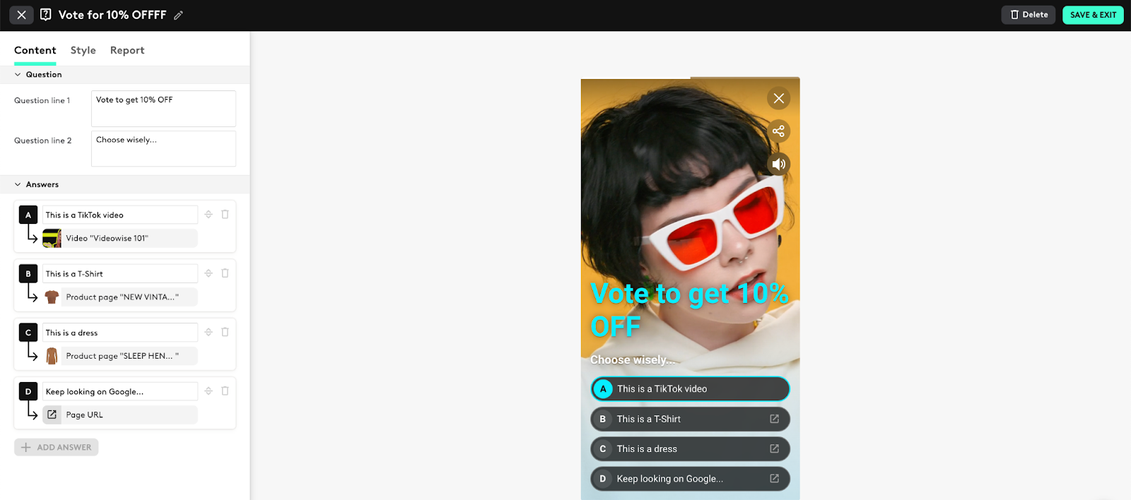 Quizzes are a great way to engage customers and direct them to products they can buy. Let’s assume you sell different shoes in your store. You could create a quiz that has four options. Each option will be a different shoe brand. You can incentivize viewers to click their preferred option to receive a discount.