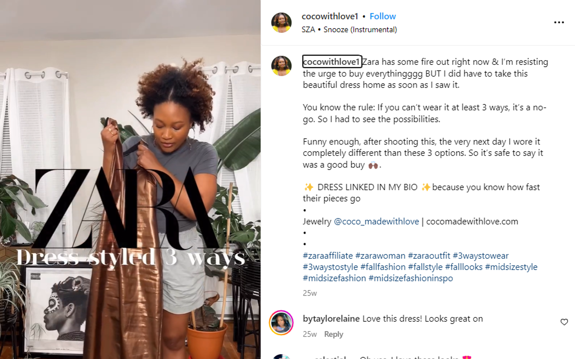Courtenay is an affiliate for Zara and posted about this dress she bought from the clothing brand with a CTA to check out the link in her bio for buying this exact dress. Now, every time somebody buys this dress using Courtenay’s unique affiliate link, she’ll receive a part of the sale as a commission.