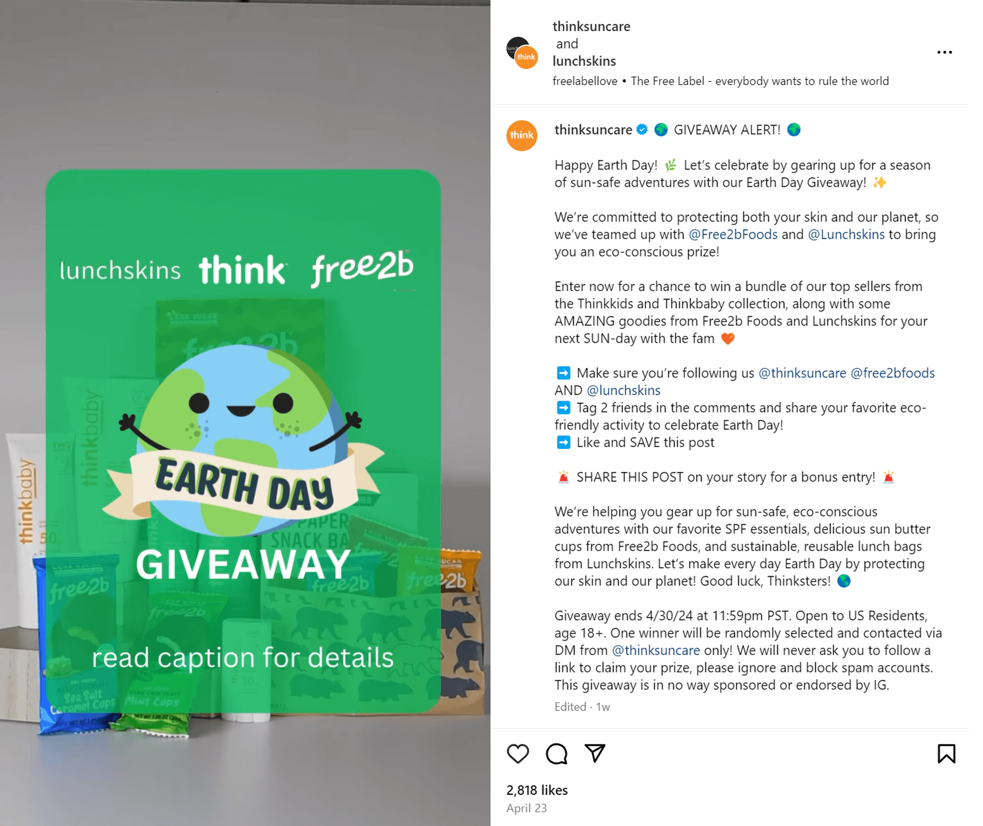 Think Sun's partnership with Lunchskins demonstrates this perfectly. Their ‘Earth Day Giveaway’ post generated over 2800 likes.