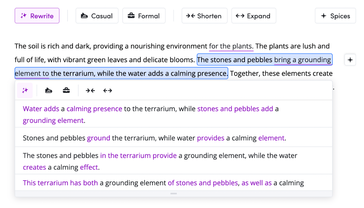 This can help your viewers feel more connected to what you are describing. AI writing tools such as Wordtune can help flesh out simple sentences and add descriptive language, to help with this.