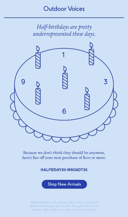 The below personalized email from Outdoor Voices offers the recipient an exclusive discount for their half-birthday with the brand.