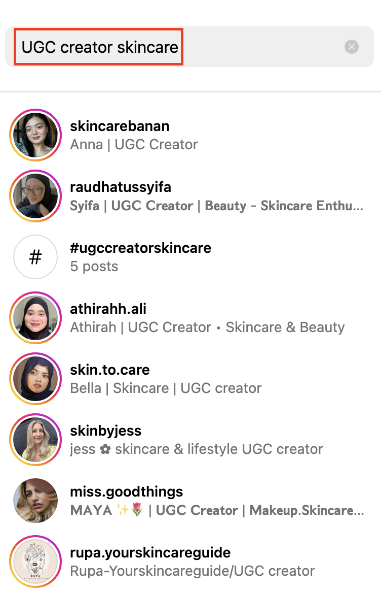 Many creators add 'UGC creator' in their bio, making it easy for brands to discover them by searching 'UGC creator + your industry.' For example, if you want to find Instagram creators in the skincare niche, you could try searching 'UGC creator skincare' directly on Instagram and scroll through the results to shortlist creators.