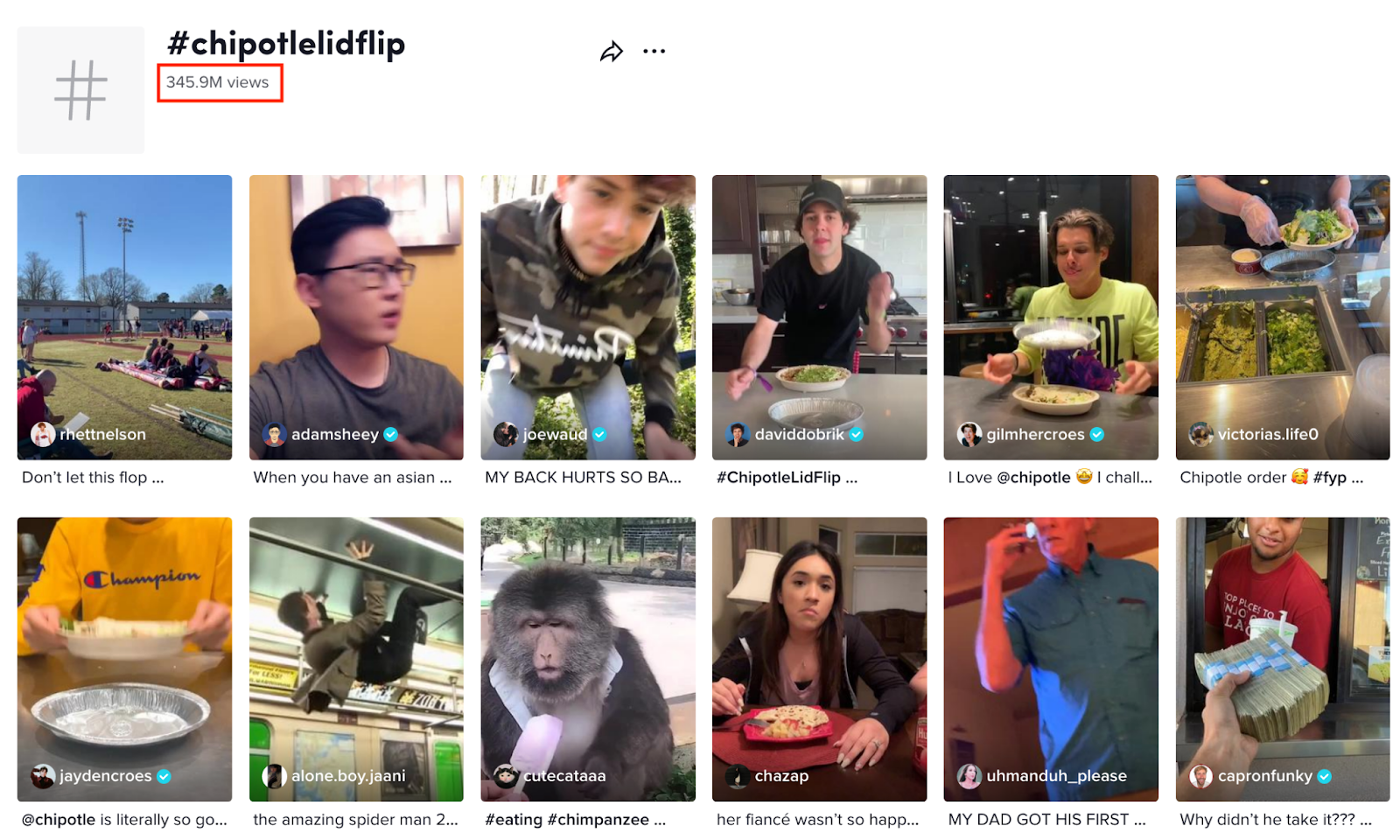 The Lid Flip Challenge campaign generated 111,000 video submissions in just six days, with record-breaking digital sales and app downloads. The hashtag #ChipotleLidFlip currently has 345.9 million views on TikTok.