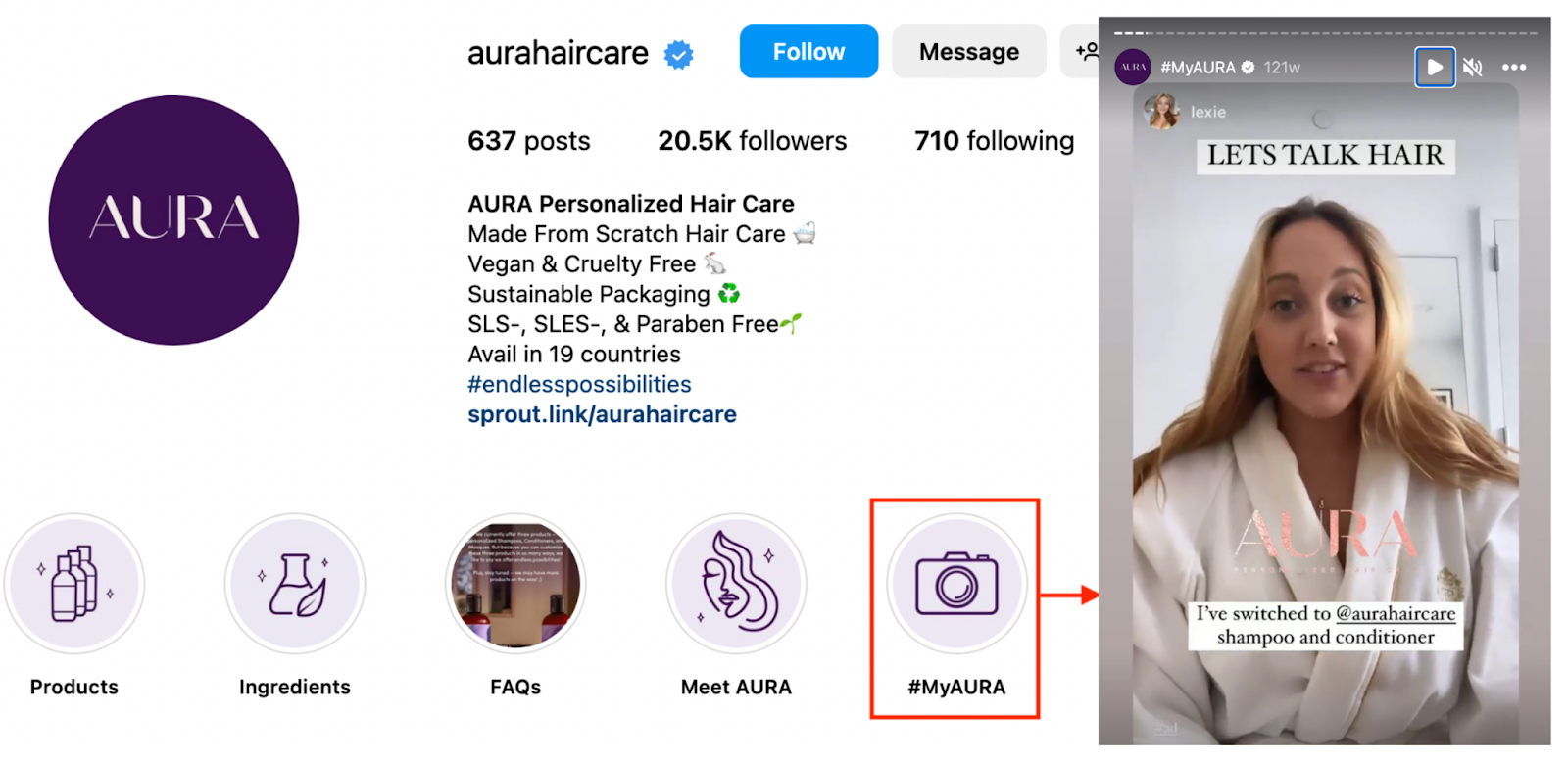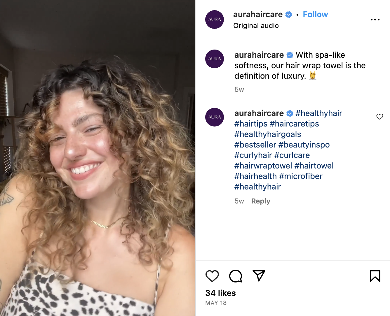 Pro tip: You can also create an employee advocacy program to encourage your employees to create UGC. Aura, a hair care brand, has 20.5K followers on Instagram in two years, and a lot of its credit goes to the UGC created by its employees.