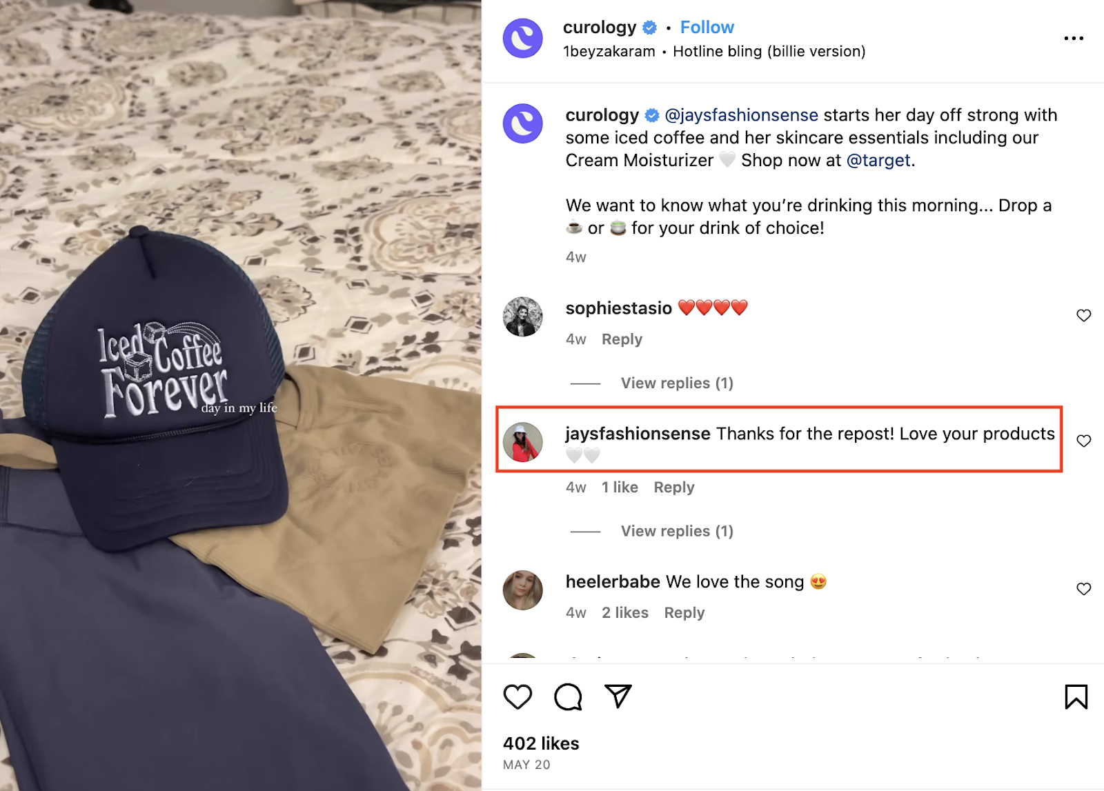 Look at this UGC posted by Curology, a skincare brand. The brand mentioned the UGC creator in the caption and added a short CTA.