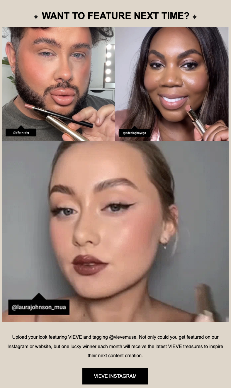 Makeup brand Vieve regularly incorporates UGC images and videos in its email and encourages its users to get featured as well.