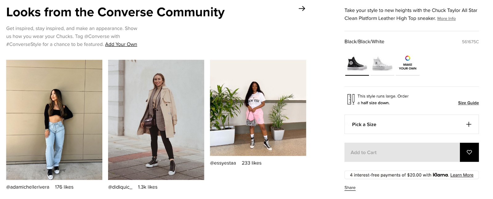 Converse, a footwear brand, does a great job of adding UGC with every product on the product page. 'Looks from the Converse Community' shows how each footwear looks and how customers are stylizing it.