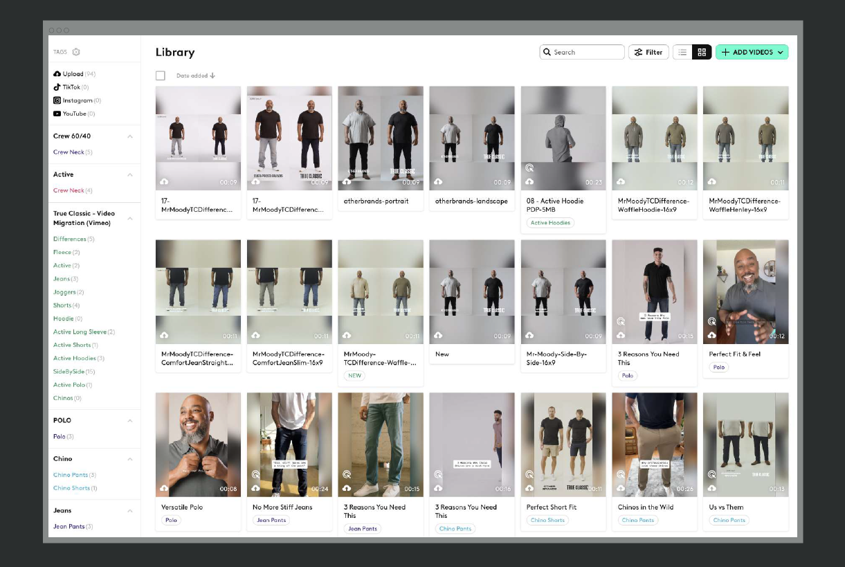 Here’s how True Classic meticulously categorized its videos to ensure streamlined accessibility and efficient management. As it continues to scale, its video content remains organized by tags and folders with advanced filtering based on video analytics.