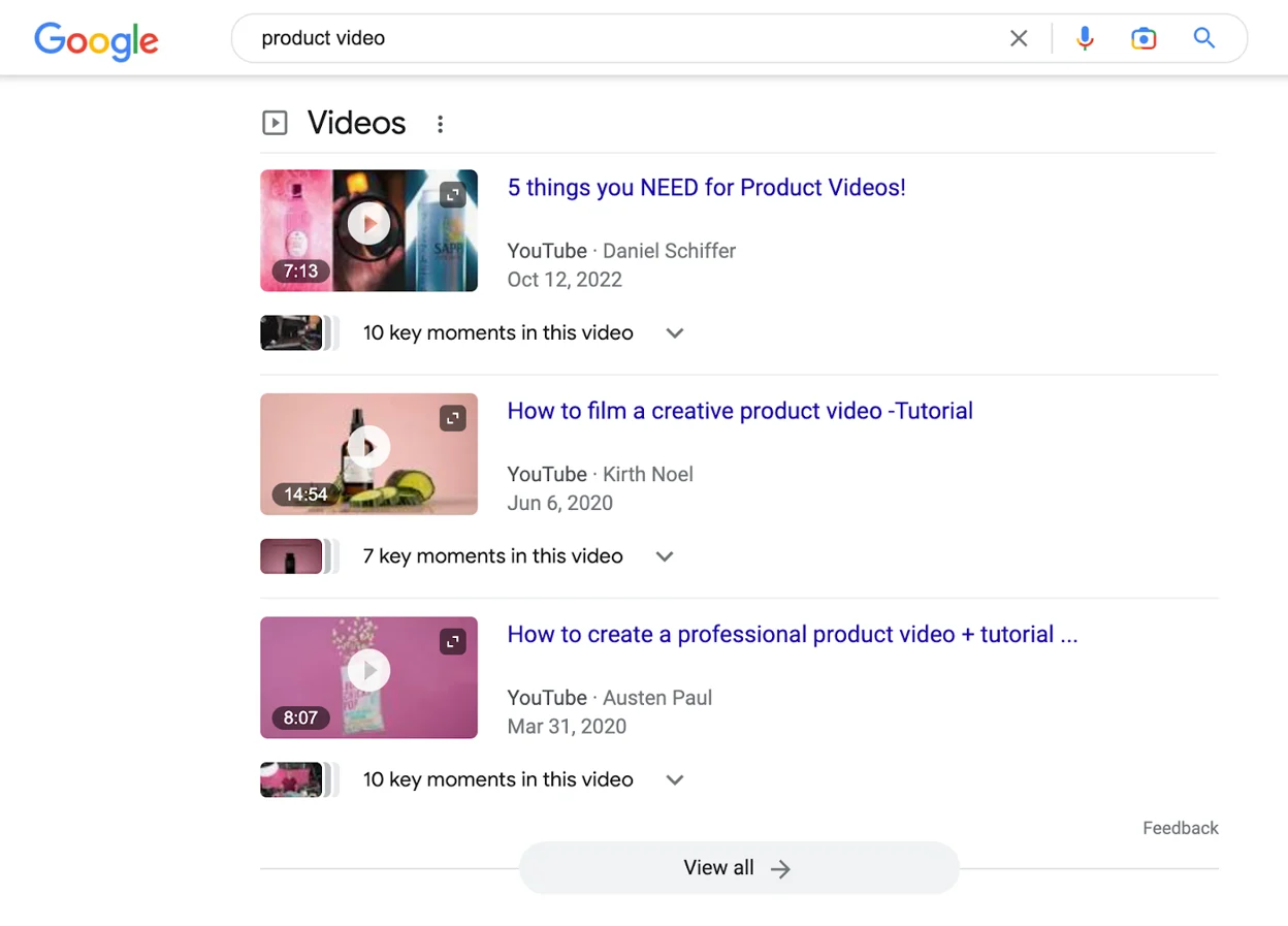 For example, we see these video results under the keyword for this article, product video: