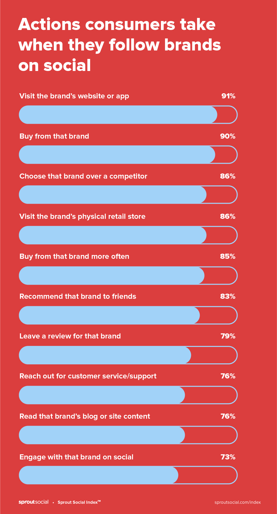 91% of consumers check out the brand's website or app after following them on social channels, and 86% will choose that brand over others.