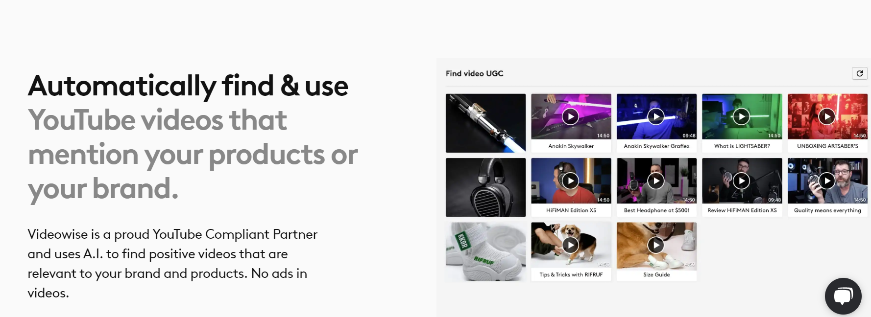 You can embed user-generated video content on your website and make them shoppable with Videowise. As a YouTube Compliant Partner, Videowise can help you find positive videos about your brand and products on YouTube, make them shoppable, and monetize them directly on your site, or you can use them in your other marketing strategies.