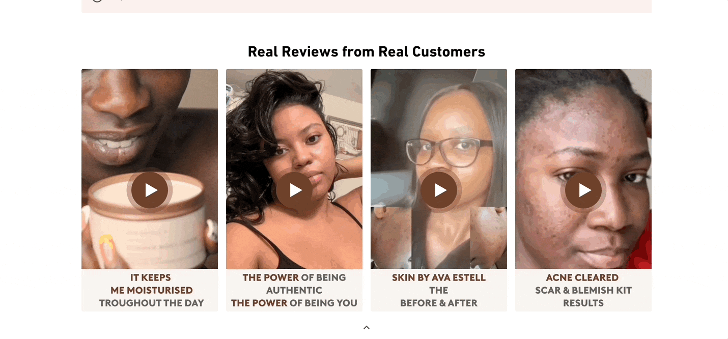 So, suppose you’re interested in purchasing Ava Estell’s “The Ultimate Body Care Set,” you’ll find video testimonials for the product on its product page like this –