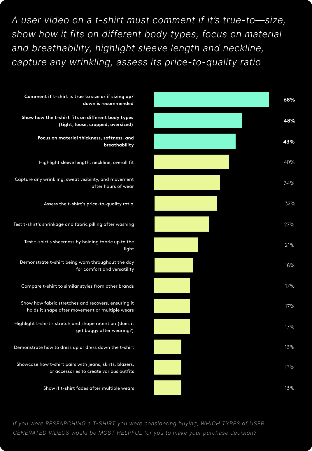 While t-shirts may seem simple, they’re one of the most frequently worn items in any wardrobe—and shoppers are paying attention. In our survey of 219 fashion consumers, 68% said they want confirmation that a t-shirt runs true to size. 43% want detailed insight into material softness and breathability, and 32% want to assess whether the price reflects quality. These insights show that video content has become a vital part of evaluating even basic apparel.