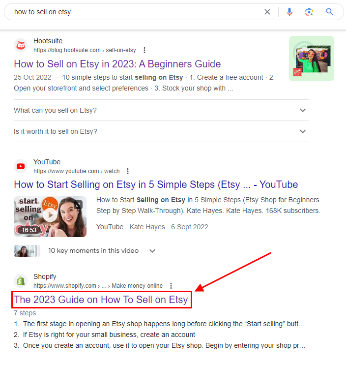 That’s how Shopify does for most of their how-to posts. For example, their article targeting the keyword “how to sell on Etsy” ranks number 4 on Google.