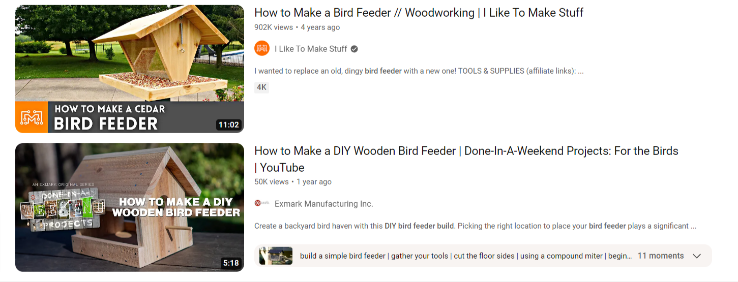 Tip: Always start with video content that can easily turn into sales. For instance, with a topic like “how to build a bird feeder out of wood,” users are not necessarily looking to buy a product as they’re trying to create something from scratch or with the materials they already have.