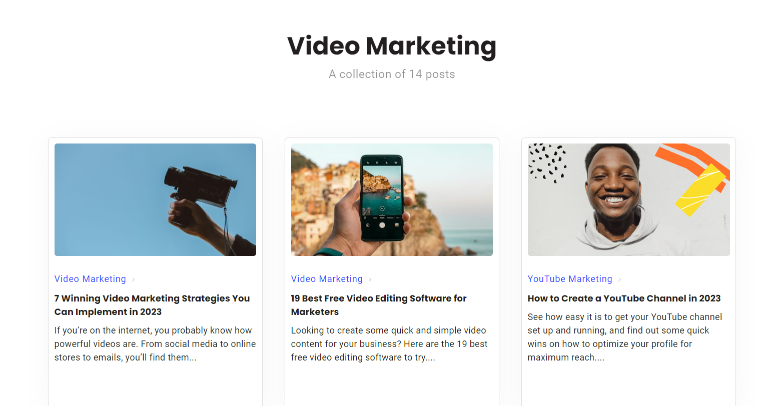 What to expect: Descript is not primarily a video marketing blog but it does feature an entire category on video production, video hosting, creating educational videos, and similar topics to help you scale your digital marketing efforts. As a business owner, you’ll learn how to create quality videos, use professional cameras and lighting equipment, and add background music [including royalty-free music] yourself.