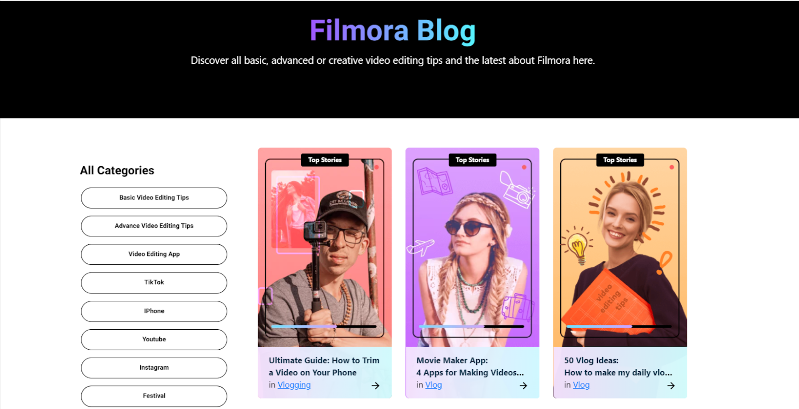What to expect: Filmora’s blog is broken down into diverse categories, so you can head over directly to what’s of top interest to you. There’s even a section for advanced video production and video editing tips.