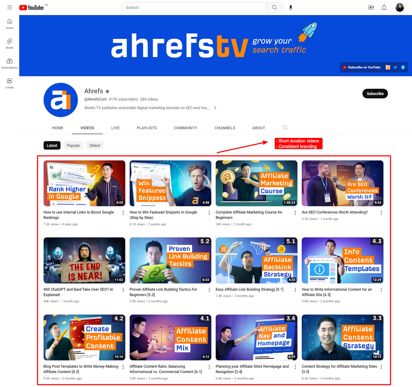 Ahrefs uses YouTube marketing to create engaging video content such as explainer videos, product-led videos, and how-to videos related to SEO and content marketing. The majority of these videos aim to educate anyone starting out in these niches or who wants to boost their skills.
