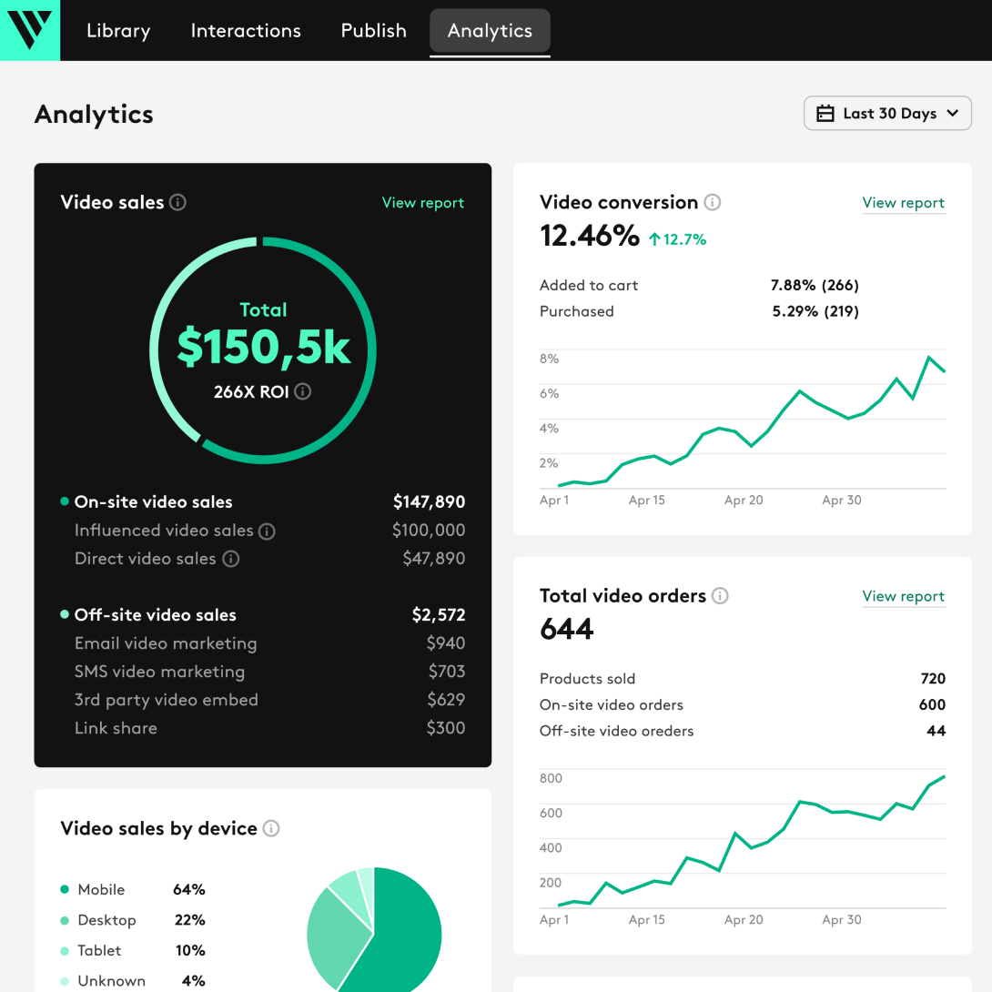 With in-depth dashboards of Videowise, as sellers, you can easily track the attribution of purchases and access advanced analytics of highest-performing videos, most watched content, top video widgets, highest performing influencer, etc., on your website.