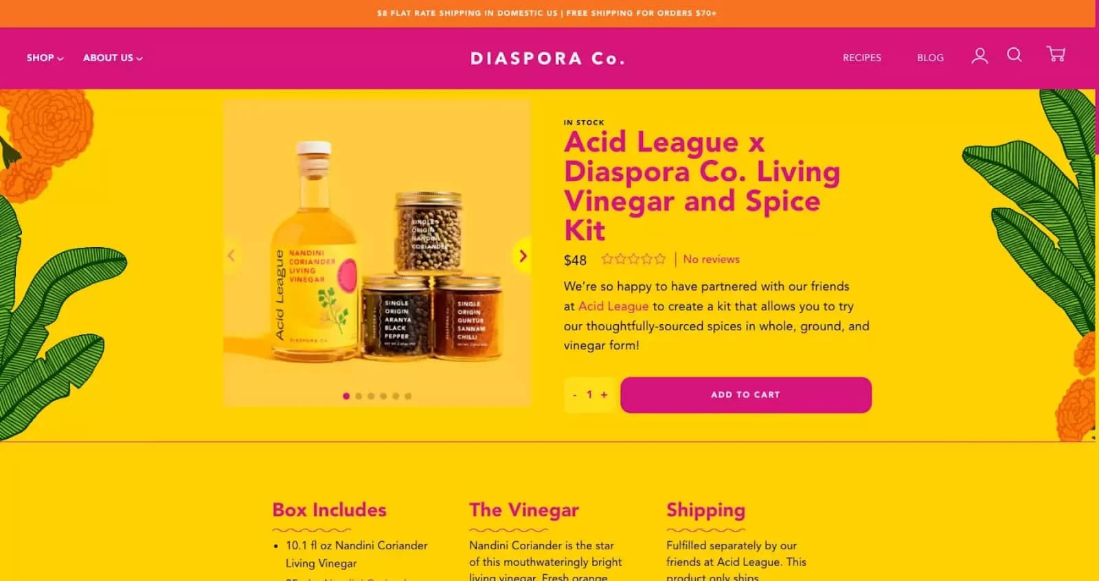 A spice brand with a big focus on the history of spices and how they are sourced and grown. Diaspora’s products are sold out once the growing season is over, which means customers have to wait for the next season to make a purchase.