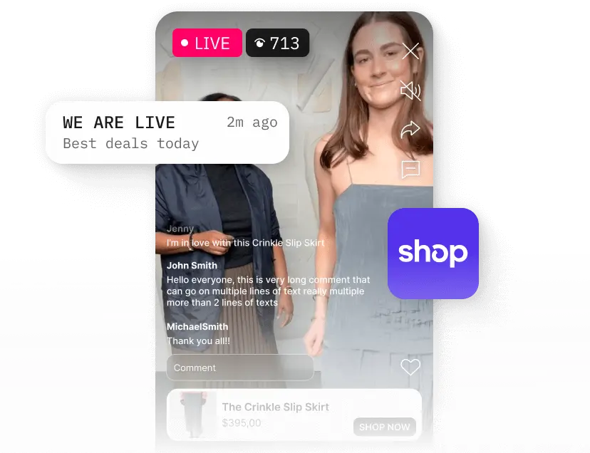 Sell live where your audience scrolls. Turn engagement into instant purchases across social and beyond.