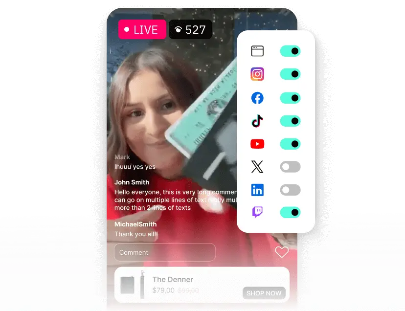 You can go live on your website, Instagram, TikTok, Facebook, YouTube, X, Linkedin, Twitch and the Shop App, all at the same time.